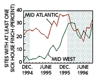 These data are also revealing such subtleties as the effects of a single severe storm on bird population. FeederWatch observations showed that the numbers of Carolina Wrens on the fringe of their range in the northeast dropped rapidly immediately after a severe snowstorm in January 1994. Yet the wrens had seemed unaffected by a similar storm that occurred two months earlier. Apparently the wrens live on the edge of disaster. Evolution has barely equipped them to survive winter, and if the weather is too bad for too long, the Carolina Wren gets clobbered. FeederWatchers are also helping chart the invasion of nonnative species. For instance, data show that the House Finch, accidentally introduced on Long Island in 1940, is still expanding in all directions. And when the House Finch is matched against the House Sparrow (introduced to the area in the mid-19th century) in head-to-head competition for resources, the House Sparrow loses badly, and its numbers plummet. All is not rosy for the House Finch, however. A nasty bacterium called Mycoplasma gallisepticum, once a blight only on poultry, recently mutated and began infecting House Finches and a few related species that occasionally forage in chicken coops. This contagious bacterium infects the eyes and can eventually kill the unlucky host. FeederWatch scientists have developed a special questionnaire to help observers identify afflicted finches. After 24 months of data collection and 22,000 data forms, the researchers can now document the spread of the disease in impressive detail [see illustration at right].