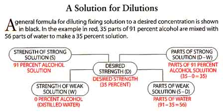 Microscopists therefore routinely preserve their treasures before scrutinizing them carefully. The process, called fixation, replaces the water in the specimen's tissues with a chemical that is incompatible with life. The fluid pressure keeps the cells plump while the chemical kills decay-producing bacteria. Cellular proteins are not soluble in many fixing agents, however; they precipitate to form a sort of plaster that sticks to cell walls. This process stiffens the cell wall and can actually increase its index of refraction, making the cell stand out under the microscope, but it ultimately destroys potentially useful information. When amateur scientist extraordinaire George Schmermund of Vista, Calif., recently brought together his interests in insects and microscopy, he uncovered a wonderful fact. Different tissues within an insect absorb the fixing agent he used at different stages in the fixing process. By observing the specimen throughout fixation, rather than waiting until the process is complete, as microscopists are often taught to do, he found that separate organ systems within the animal became highlighted sequentially. This let Schmermund take the stunning pictures of insect insides that you see here. His technique empowers any amateur microscopist to explore insect interiors in a detail unmatched by any other method I know. Begin your own fantastic voyage by securing some suitable specimens. Small ants and fleas make ideal subjects. Schmermund kills them by placing them in his freezer for a few hours. His fixing agent is ordinary isopropyl (rubbing) alcohol. Isopropyl alcohol is inexpensive, readily available and easy to handle. My local drugstore stocks isopropyl alcohol in concentrations of 70 and 91 percent. Buy the highest concentration you can find. For reasons that will become clear in a moment, if you intend to create a permanent library of mounted specimens you'll need to purchase pure (anhydrous) isopropyl alcohol from a chemical supply company. (Note that denatured alcohol is a blend of mostly ethanol and methanol; it is not isopropyl alcohol. Both substances are also fixing agents, but methanol is highly poisonous. If you choose to experiment with denatured alcohol, take appropriate precautions to protect your family and pets.) The box above gives a recipe for diluting your fixing solution to any desired concentration. Schmermund took these photographs using only two dilutions: 35 and 70 percent. The time required at each stage depends on the specimen's size. Soak garden ants and fleas for at least one hour. Larger insects may take as long as six hours. The volume of solution should be at least 20 times that of your specimen's body, but for ant-size specimens that is still a tiny amount of alcohol. Schmermund soaks his specimens in bottle caps and transfers the chemicals with eyedroppers. To get views like those you see here, you must regularly check the insect while fixing. Transfer the insect to a well slide (a slide with a polished depression to receive the sample) with a drop of fixing solution, rest a slide cover on top, then set sail into uncharted waters. Transfer and position the specimen with laboratory tweezers (available at a laboratory supply store and often at your local swap meet) and an eyedropper. Unfortunately, neither water nor alcohol mixes with the compounds used to glue your specimen permanently to the slide. So to share your specimen with posterity, you must first replace every trace of both water and alcohol with a solvent that will mix with the glue. The process that removes the alcohol is called clearing. Clearing will make your specimen largely transparent and will destroy much of the contrast created during the fixing stages. You can lock in some permanent contrast by staining your specimen with various commercially available dyes, such as borax carmine or alum cochineal. But no method I know of produces the level of contrast in specific tissues that naturally develops during the fixing process.
