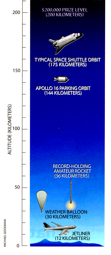 One source of help is the Tripoli Rocketry Association in Bessemer, Ala. Tripoli is perhaps the world's premiere rocketry organization. It schools and certifies its members in the art of making and safely flying high-powered rockets. Tripoli organizes regular gatherings, at which devotees of the sport fire their often spectacular handiwork at so-called LDRS launches (the acronym stands for "large and dangerous rocket ships"). What strikes me most on reading Tripoli's magazine, High Power Rocketry, is that so many firms sell sophisticated rocketry supplies. One of these companies, Rocketman Enterprises, in South Bloomington, Minn., is headed by the most colorful rocketeer I know: Ky Michaelson is a 59-year-old stuntman who attaches rockets to everything from skates to motorcycles. This past summer he attempted to send a two-stage, 136-kilogram vehicle to 192 kilometers, just shy of the FINDS target. The second stage failed, but the first stage reportedly accelerated to Mach 2.6 (2.6 times the speed of sound) and topped out at nearly 24 kilometers. The current record for verified altitude obtained by an amateur rocket is owned by the Hyperion I and its designer, Korey Kline. Kline, a Tripoli member for more than 15 years, is director of research at Environmental Aeroscience Corporation in Miami. His company specializes in fabricating rocket motors for commercial and hobby use. Kline is an expert on what are known as hybrid motors, which combine solid fuel with fluid oxidizer. His creation, a cylindrical tube 15 centimeters wide by 5.5 meters tall, was powered by such a hybrid. Launched on January 7, 1997, from the NASA Goddard Space Flight Center's Wallops Flight Facility, the Hyperion I devoured its 48 kilograms of propellant in just 15 seconds, passing Mach 3 before coasting upward to 36 kilometers. Kline is currently building a beefed-up version, the Hyperion II, to aim for the FINDS prize. If all goes well, he intends to launch late in 1998. A fundamental problem that Kline and his rockets face is atmospheric drag, which increases drastically as the velocity rises (drag is in fact proportional to velocity squared). By achieving its maximum velocity quickly, while it is still low in the atmosphere, Hyperion I expended a great deal of energy battling the air around it, energy that would otherwise have lofted the rocket much higher. John M. Powell of JP Aerospace in Davis, Calif., sidesteps this problem by avoiding most of the atmosphere altogether. Powell is a computer programmer and lifelong space enthusiast who delights in his group's motto: "America's other space program." Powell and his companions have spent much of the past 18 years systematically developing an ingenious system to launch rockets from weather balloons, a trick pioneered by NASA. Although Powell's tests have so far been restricted to low altitudes, he believes he can ultimately launch his existing rocket from 30 kilometers (about 100,000 feet) to a height of 80 kilometers. He intends to capture the FINDS prize by scaling up his operation and then to use the money to develop a system that can put small payloads into orbit. Although the FINDS prize is meant to stimulate advances in rocket technology, the new amateur space race also needs electrical engineers, radio hobbyists and science enthusiasts of all stripes who want to help build and fly useful payloads. After all, without proper instruments, amateur rockets--whatever altitudes they may reach--will remain little more than especially flashy Roman candles. So if you think you have something to contribute, find a rocketry group and get involved; there should be plenty of them out there vying for the FINDS prize. Even the Society of Amateur Scientists is gearing up to join this new amateur race into space. To get involved, consult the Society for Amateur Scientists's World Wide Web site. You may also write the society at 5600, Post Road, #114-341, East Greenwich, RI 02818, or call 1-401-823-7800. Images: Micheal Goodman Suppliers and Organizations The Society for Amateur Scientists (SAS) is a nonprofit research and educational organization dedicated to helping people enrich their lives by following their passion to take part in scientific adventures of all kinds. The Society for