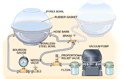 Fortunately, cheaper solutions exist. Hansen found that an $8 proportional relief valve works quite well. His choice is model number VR25, manufactured by Control Devices in St. Louis, Mo. (You can purchase one from W. W. Grainger: 773-586-0244; catalogue number 5Z-763.) The vacuum pump pulls air from the chamber, and the valve allows a weak flow of air to pass in from the outside. This adjustable leak prevents the full force of the vacuum pump from acting on the chamber, allowing the internal pressure to stay higher than it would otherwise. The needle valve allows a weak but constant stream of air to flush out any gases produced by living things inside. Although it is a bit tricky to adjust the proportional relief valve to a particular pressure, once properly set, the chamber will maintain that level reliably. Still, you will have to keep your vacuum pump running all the while. Note that if the outside air pressure rises or falls, so will the pressure inside your chamber. Certain biological experiments might require you to vary the temperature and light levels. Try putting the chamber on a windowsill, resting the stainless-steel bowl on a heating pad or submerging it in a bucket of ice water. For more precise adjustments, you may place the chamber under a full-spectrum light controlled by a timer and run a heat source from a thermostat. After struggling with homemade thermostats for years, I recently gave in and purchased a $165 unit from Omega Engineering in Stamford, Conn. (800-826-6342 or 203-359-1660; catalogue number CN8590). If you go this route, you will also need to purchase 25 feet of type T thermocouple wire (Omega's catalogue number is PR-T-24SLE-25). It consists of two wires made from copper and constantan laid side by side. Cut a length of this double wire so that it is long enough to reach from the controller to the inside of your chamber. From one end, strip two or three centimeters (about an inch) from the tips of both wires and twist the exposed leads together. Once intertwined, a tiny voltage develops that is related to the temperature of the coupled wires. Attach the other ends of the wires to the controller. You will have to feed the thermocouple wires (and any other electrical cables required for your particular experiment) into your chamber without creating leaks. Another hose barb serves well here. Pass the wires through the barb and then secure them in place by filling the tube with epoxy. After the epoxy sets, install this assembly through the stainless-steel bowl just as you mounted the others earlier. The controller I used can deliver a maximum of five amperes at 120 volts AC--that is, it is limited to a power output of 600 watts. Omega sells many suitable heaters, but you could probably coat the sides of the steel bowl with a sprayable foam insulation and rest the exposed metal bottom on a small hot plate, such as the kind designed to keep your morning coffee warm in the cup. Finally, you may find it useful to build two identical chambers and tie them together with a T-shaped joint. This duplication will allow you to run two experiments simultaneously, using one chamber for tests and the other as the control. At times, you may want to keep the second chamber at full atmospheric pressure. But should you wish to vary light level or temperature only, this arrangement will let you maintain the same low pressure in both chambers. Try growing tropical plants at alpine altitudes or test whether a fly tires more quickly in thin air. With a little imagination, you can continue such rarefied pursuits indefinitely. Amateurs interested in vacuum-related experiments can subscribe to the Bell Jar. Send a check or money order for $20 to the Bell Jar, 35 Windsor Drive, Amherst, NH 03031. For more about this and other amateur science projects, visit the Forum section of the Society for Amateur Scientists's World Wide Web site. You can also write the society at 5600, Post Road, #114-341, East Greenwich, RI 02818 or call 1-401-823-7800. Suppliers and Organizations The Society for Amateur Scientists (SAS) is a nonprofit research and educational organization dedicated to helping people enrich their lives by following their passion to take part in scientific adventures of all kinds. The Society for