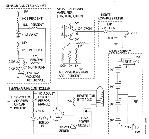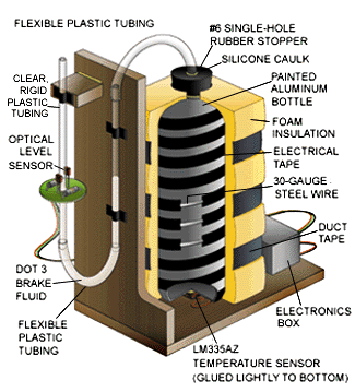 Yet even the largest atmospheric tsunamis are quite difficult to detect. The pressure excursions that betray their passage are typically just a few millibars (thousandths of one atmosphere), and these tiny undulations often take tens of minutes, or even longer, to go by. Instruments that can monitor such subtle signals are called microbarographs, and professional units can cost thousands of dollars. But, thanks to Paul Neher, a gifted amateur scientist from Las Cruces, N.M., anyone can now observe these ephemeral waves for about $50. Neher uses a manometer (in this case, a U-shaped tube and sensor) [see illustration on this page] to balance the barometric pressure against the air pressure trapped inside an aluminum bottle that is kept a bit warmer than the surrounding air. Because the pressure of an isolated gas varies with temperature, any shift in external pressure can be matched by changing the temperature of the air inside the bottle. Neher's instrument senses external pressure fluctuations by monitoring the height of a liquid in the manometer. A rise in external pressure presses the liquid down into the manometer and triggers a heating coil that warms the bottle. If the pressure drops, the level of the liquid rises, and the heater is kept off, thus allowing the bottle to cool a little to compensate. Monitoring the temperature changes with the circuit shown on the opposite page reveals minuscule shifts in air pressure. For the aluminum container, Neher completely drained a tire inflator bottle of 32-ounce (about one-liter) size and then replaced the crimped-on cap with a single-hole rubber stopper. He fashioned his manometer from a piece of glass tubing, which he bent after heating with a propane torch. But you can link two clear, rigid plastic tubes with a short, flexible plastic hose. You'll need to fill this assembly about one-third full with a liquid that has a low viscosity and does not evaporate. Neher uses clear brake fluid in his device. The instrument senses changes in the fluid level by using the transparent liquid to focus the light from an infrared light-emitting diode (LED) onto a phototransistor. When the liquid drops below the set point, the defocused light becomes too diffuse to detect. This change causes the circuit attached to the phototransistor to send an electric current through the heater. Neher employed "beading wire," which he obtained from a craft store, for the heating filament. Hobbyists use this 30-gauge (1/4-millimeter) steel wire to make necklaces, but it has a resistance of about one ohm per foot (about three ohms per meter), which is ideal for this application. After electrically insulating the bottle with a layer of enamel paint, wrap 10 evenly spaced turns along the length of the bottle and secure them with electrical tape. Surround the wrapped bottle with a few inches (about 10 centimeters) of an insulating material such as foam rubber or a spray insulation (which you can purchase at a hardware store). When operating, the circuit heats the bottle slightly every 10 seconds or so, replacing the tiny amount of heat that leaches through the insulation, thereby keeping the level of the fluid stable. The LM335AZ chip is a sensitive solid-state thermometer that varies its output voltage by 10 millivolts for each degree Celsius change in temperature. This marvel can measure temperatures to about 0.01 degree C, which corresponds to an ultimate pressure resolution approaching 20 microbars--that's a scant 20 millionths of one atmosphere. To begin your observations, disconnect the tube that links the manometer to the aluminum bottle, then heat the bottle about 10 degrees C (18 degrees Fahrenheit) above room temperature by blocking the light from reaching the phototransistor. Reconnect the tube and allow the circuit to stabilize the bottle at this elevated temperature. It's easy to see if your instrument is working: just lift it. It should register the 100-microbar drop in pressure that results when you raise it about one yard (one meter). You will want to calibrate the microbarograph over a larger range than you can easily generate by shifting its height. The solution is quite simple: move the LED-phototransistor pair up or down a bit on the manometer column. The circuit will then adjust the temperature inside the bottle to raise or lower the liquid between the LED and phototransistor to match. This manipulation causes the fluid level to become uneven, with the weight of the unbalanced liquid being supported by the pressure difference between the atmosphere and the air inside the bottle. The specific gravity of DOT 3 brake fluid, which is widely available in the U.S., is 1.05. For this value, each inch (centimeter) difference in the level of the liquid corresponds to a pressure difference of 2.62 millibars (1.03 millibars).