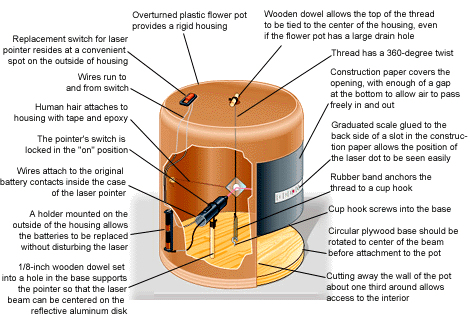 To start, you'll need one human hair, preferably straight and reasonably long. Wash it thoroughly with soap and water to remove the natural oils. You will also require a housing for your instrument. This enclosure must be rigid, but it should be made from a material that is easy to cut and drill. I used a plastic pot of the kind used to hold a large houseplant. The reflector must remain stiff yet be as lightweight as possible. A glass coverslip (the thin wafer normally placed over a specimen on a microscope slide) is ideal, except that it is not very reflective. You can remedy this situation by using aluminum foil. Rest a layer of foil on some stiff paper and punch through both sheets using a standard hole punch. Then separate a small, undamaged disk of shiny aluminum. Secure it (dull side down) to the center of the coverslip with a dab of epoxy, gently rubbing the foil smooth with a handkerchief. Use a toothpick to draw a bead of epoxy across one diagonal on the back side of the coverslip. It helps to turn a drinking glass upside down and place the coverslip on top, with the epoxy bead facing upward. Next drape a generous length of fine thread along the line of epoxy and hang small weights from either side as the epoxy sets to pull the thread taut. Then attach the hair with a dollop of epoxy placed between the center of the coverslip and one free corner. The sensitivity of this instrument depends on exactly where you attach the hair: the closer it is to the thread, the larger the angle through which the mirror will rotate. Because some people's hair responds more to humidity than others', no one prescription will work for all hygrometers. Therefore, you will need to experiment to find the best place on the coverslip to attach the hair. After the epoxy hardens, secure your glass reflector into the instrument housing by affixing one end of the thread to the top and the other to the bottom, using a rubber band to maintain some tension. Make sure that when you look directly at the reflector, the hair is on the back of the slide cover and left of center. That way your humidity scale will increase from left to right. Before you attach the free end of the hair to the instrument case, you must rotate the reflector clockwise around the string once. The resulting torque should cause the reflector to pull the hair taut as the thread tries to untwist. A laser pointer makes an ideal light source because it produces an extremely bright spot that can be readily seen, even in daylight. Such pointers are available for less than $50 from many sources, including Radio Shack and Jameco Electronics (telephone: 650-592-8097). But it is vital that you rig the pointer initially so that you never have to touch it again, because the slightest inadvertent nudge will upset the calibration of your instrument. The trick is to put a switch and batteries for the pointer on the outside of the hygrometer housing. To mount the pointer itself, trim a wooden dowel to the appropriate length and attach the laser to one end. If your laser pointer has a flat case, epoxy it directly to the end of the dowel. If the case is round, gird it with a loop of coat-hanger wire and lash the ends to the dowel as shown in the illustration. Secure this assembly with a liberal coating of epoxy. To make a scale, use a photocopier to transfer the markings from a fine ruler onto a sheet of paper, then snip out these graduations in a strip approximately two inches (five centimeters) wide. Glue this scale behind a long, rectangular hole in some dark-colored construction paper and attach the paper to the housing so that the laser beam illuminates the scale from the back side. If you intend to use your instrument in very moist environments, you should protect the paper parts from warping with a plastic coating. Spray plastic can be purchased from any well-stocked hardware store. Your completed hygrometer should be easy to calibrate. First, take it into your bathroom and turn on the shower. As the humidity rises, you will see the bright spot shift to the right. (If you haven't coated the paper parts with plastic, turn off the shower as soon as your bathroom mirror is covered with a thin film of condensation so as not to overload the air with moisture.) When the air is saturated, mark the location of the dot on the scale. Hair-based hygrometers respond sluggishly to changes in humidity, so wait at least 20 minutes before marking your scale. This point represents 100 percent humidity. You can attain almost zero humidity by placing a substance that readily absorbs moisture at the base of the hygrometer and sealing the instrument inside a transparent plastic bag. Any number of things will absorb water from the air: for example, powdered gelatin, activated charcoal and those little silica gel packets often found bundled with new purchases. Cobalt chloride, which you may be able to obtain from a chemical supplier, is the desiccant of choice, because it changes from blue to pink as it absorbs moisture. If, when the dot of light stops drifting to the left, you have plenty of blue crystals remaining in the bag, you can be confident that the air inside is at near-zero humidity. Be sure to bake whatever drying material you use at 300 degrees Fahrenheit (about 150 degrees Celsius) for at least an hour to remove any water already absorbed before you place it in the bag. In general, the humidity scale will not be linear between your zero and 100 percent marks, so you should check several intermediate points against a well-calibrated instrument. One easy way to do so (albeit indirectly) is to put the unit outside and compare your measurements with readings from the local weather department. Once properly calibrated, this device will allow you to perform diverse experiments. You can, for example, measure the rate of evaporation from different kinds of soil into dry air at a variety of temperatures. Or you can monitor how quickly different species of plants transpir
