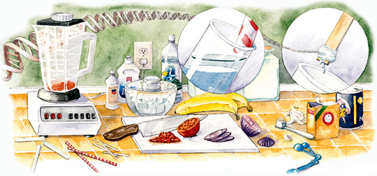 At work Michelle employs the latest techniques in biochemistry to unravel the secrets of photosynthesis. By manipulating the smallest units of inheritance, the individual base pairs on a single strand of DNA, she can change one by one the amino acids that make up a key protein and then study how well this altered molecule can do its job. Hearing about Michelle's research so often at the dinner table recently prompted me to try my hand at molecular biology. Although the many cutting-edge techniques she uses are probably beyond the range of amateur dabbling, recent advances have opened up intriguing avenues for informal explorations into biotechnology. To help clear the way, this column explains how anyone can do what biotechnologists do routinely: extract and purify DNA. DNA is the largest molecule known. A single, unbroken strand of it can contain many millions of atoms. When released from a cell, DNA typically breaks up into countless fragments. In solution, these strands have a slight negative electric charge, a fact that makes for some fascinating chemistry. For example, salt ions are attracted to the negative charges on DNA, effectively neutralizing them, and this phenomenon prevents the many separate fragments of DNA from adhering to one another. So by controlling the salt concentration, biologists can make DNA fragments either disperse or glom together. And therein lies the secret of separating DNA from cells. The procedure is first to break open the cells and let their molecular guts spill into a buffer, a solution in which DNA will dissolve. At this point, the buffer contains DNA plus an assortment of cellular debris: RNA, proteins, carbohydrates, and a few other bits and pieces. By binding up the proteins with detergent and reducing the salt concentration, one can separate the DNA, thus obtaining a nearly pristine sample of the molecules of inheritance. My profound thanks go to Jack Chirikjian and Karen Graf of Edvotek, an educational biotech company in West Bethesda, Md., for showing me how anyone can purify DNA from plant cells right in the kitchen. You'll first need to prepare a buffer. Pour 120 milliliters (about four ounces) of water into a clean glass container along with 1.5 grams (1/4 teaspoon) of table salt, five grams (one teaspoon) of baking soda and five milliliters (one teaspoon) of shampoo or liquid laundry detergent. These cleaners work well because they have fewer additives than hand soaps--although do feel free to try other products as well. The detergent actually does double duty. It breaks down cell walls and helps to fracture large proteins so they don't come out with the DNA. The people at Edvotek recommend using pure table salt and distilled water, but I have used iodized salt and bottled water successfully, and once I even forgot to add the baking soda and still got good results. In any case, try to avoid using tap water. To slow the rate at which the DNA degrades, it's best to chill the buffer in a bath of crushed ice and water before proceeding. For a source of DNA, try the pantry. I got great results with an onion, and the folks at Edvotek also recommend garlic, bananas and tomatoes. But it's your experiment: choose your favorite fruit or vegetable. Dice it and put the material into a blender, then add a little water and mix things well by pulsing the blades in 10-second bursts. Or, even simpler, just pass the pieces through a garlic press. These treatments will break apart some of the cells right away and expose many cell walls to attack by the detergent. Place five milliliters of the minced vegetable mush into a clean container and mix in 10 milliliters of your chilled buffer. Stir vigorously for at least two minutes. Next you'll want to separate the visible plant matter from the molecule-laden soup. Use a centrifuge if possible. (To learn how to build a centrifuge, see the January Amateur Scientist column.) Spin the contents at low speed for five minutes and then delicately pour off at least five milliliters of the excess liquid into a narrow vessel, such as a clean shot glass, clear plastic vial or test tube. If you do not have a centrifuge, strain the material through an ordinary coffee filter to remove most of the plant refuse. With luck, any stuff that leaks through should either sink or float on top, so it will be a simple matter to pour off any solids into the sink and then pour the clear liquid into a clean vessel. The solution now contains DNA fragments as well as a host of other molecular gunk. To extract the DNA, you will need to chill some isopropyl alcohol in your freezer until it is ice-cold. Most drugstores sell concentrations between 70 and 99 percent. Get the highest concentration (without colorings or fragrances) you can find. Using a drinking straw, carefully deposit 10 milliliters of the chilled alcohol on top of the DNA solution. To avoid getting alcohol in your mouth, just dip the straw into the bottle of alcohol and pinch off the top. Allow the alcohol to stream slowly down along the inside of the vessel by tilting it slightly. The alcohol, being less dense than the buffer, will float on top. Gently insert a narrow rod through the layer of alcohol. (Edvotek recommends using a wooden coffee stirrer or a glass swizzle stick.) Gingerly twirl back and forth with the tip of the stick suspended just below the boundary between the alcohol and the buffer solution. Longer pieces of DNA will then spool onto the stick, leaving smaller molecules behind. After a minute of twirling, pull the stirrer up through the alcohol, which will make the DNA adhere to the end of the stick and appear as a transparent viscous sludge clinging to the tip. Although these results are impressive, this simple and inexpensive procedure does not yield a pure product. Professionals add enzymes that tear apart the RNA molecules to make sure they do not get mixed up with the coveted DNA. Even after the most thorough extraction, some residual DNA typically lingers in 