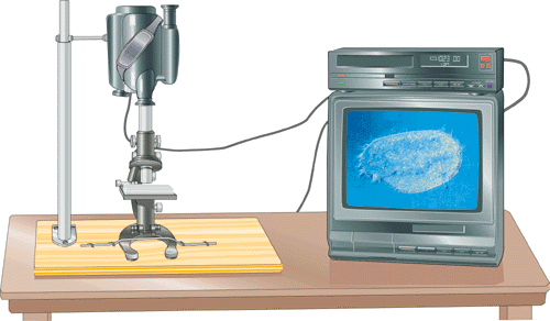 To attach the camcorder to the rod, Carter cleverly exploits the threaded sleeve on the base of the unit (where a tripod would normally screw in). While holding the microscope-camera combo upright with one hand, mark a line on the outer tube of the closet rod about one inch below the tripod mount. Then cut the outer tube off at that point with a pipe cutter or hacksaw. Next, cut the inner tube of the closet rod so that when it is inserted all the way in, it sticks out about four inches. If you have a stage-focusing microscope, you can dispense entirely with the inner rod and attach the camera directly to the primary support. Next, drill a 1/4-inch hole into the inner rod so that the camera can be secured using a long 1/4-20 bolt. Slip a washer on the bolt, push the bolt through the rod, and add another washer and two nuts. Now screw the bolt into the camcorder and tighten the nuts, one against the closet rod and the other against the camera. Fix the microscope to the plywood stand by securing it with a length of plumber's strapping across the base. Now you're ready to spy on an invisible realm. To use your new apparatus, focus the microscope until a clear image appears on your monitor and then adjust the zoom on the camcorder until the image fills the screen. Although this system will enable you to take leisurely safaris through microscopic jungles, it may be difficult to gauge the size of your minute prey. The best way to address this problem is to measure on your monitor the dimensions of something of known size. For example, you can view the tiny, gridded dots in the large, gray A at the beginning of this article; they are spaced at intervals of 169 microns. I invite professional and amateur microscopists to share other suggestions for calibrating this instrument with the Society for Amateur Scientists by joining the discussion on the society's Web site. For more information about projects described in this column, check the forum conducted by the Society for Amateur Scientists on the World Wide Web. You can also write the society at 5600, Post Road, #114-341, East Greenwich, RI 02818, or call 1-401-823-7800. Images: Ian Worpole Suppliers and Organizations The Society for Amateur Scientists (SAS) is a nonprofit research and educational organization dedicated to helping people enrich their lives by following their passion to take part in scientific adventures of all kinds. The Society for Amateur Scientists Wondering where you can purchase the science supplies needed to perform this Amateur Scientist project? At WARDS you can find everything you need need for studies in the biological and environmental sciences. WARDS
