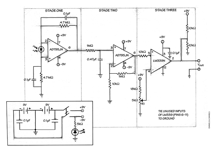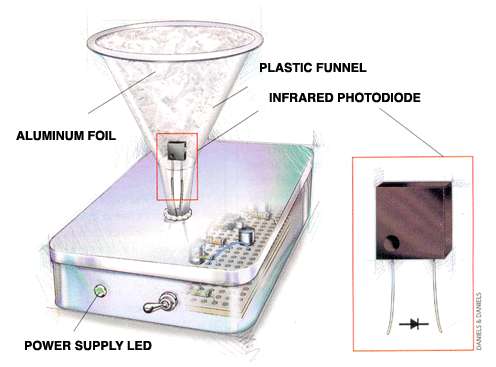 In complete darkness, stage two of my prototype gave a signal of 3 millivolts with random fluctuations of about 0.3 millivolt. When I placed the device inside a dark and windowless bathroom and pointed my TV remote under the door, the output jumped 300 millivolts. The third and final stage uses a chip called a comparator to check the output against a reference voltage that mimics a cloudless sky. The LM339, available from Radio Shack (part no. 276-1712) for about $1, has four comparators on a single chip, only one of which is needed here. The comparator turns the analog signal from the second stage into a two-stage output to indicate cloudy or clear. For use as a cloud detector, encase the circuit in a grounded and weatherproof metal box. Cement aluminum foil inside a large plastic funnel and mount the photodiode near the bottom [see illustration at right]. This reflective horn guides skylight onto the sensor and blocks radiation from the ground. Mount the horn so that it points straight up. Under a starry sky, the second stage of my unit put out about 0.5 volt. When clouds rolled in, it increased to a little over 1 volt. It did not respond to moonlight. To calibrate the instrument, point the horn straight up on a clear night and adjust the potentiometer R1 until the voltage at the comparator's negative input is 0.2 volt greater than the signal registered at its positive input. Then the output of the third stage should be approximately 0 volts. When you tip the reflective horn toward a light, the reading should jump to almost 5 volts. Test the detector on the next cloudy night. The circuit should generate about 0 volts when the horn is covered and about 5 volts when exposed to the cloudy sky. Readjust R1 if necessary. City dwellers and suburbanites should both be able to find a setting that reliably distinguishes between clear and cloudy skies. Given a suitable interface, this signal could be fed into a computer. With minor changes, you can create other useful instruments. For example, if you read the output of the second stage directly with a digital voltmeter, you have an extremely sensitive near-infrared light meter. Because an object passing by will change the amount of infrared energy that reaches the sensor, the device can also be used as a motion detector. Replacing the infrared photodiode with one that is more sensitive to visible light makes a visible-light radiometer, which can do such things as measure the light pollution in the night sky and the energy output of bioluminescent organisms. Those interested in learning more about Robson's telescope project can reach him directly at 860-354-1595. For more information about this and other projects from this column, check out the Society for Amateur Scientists's Web page. As a service to the amateur community, SAS can supply the electronics components for this project (photodiode, op-amps, comparator, capacitor and resistors only) for $30 plus $5 shipping until May 2000. Send a check to the society at 5600, Post Road, #114-341, East Greenwich, RI 02818, or call 1-401-823-7800. I gratefully acknowledge informative conversations with George Schmermund and Russell Wallace. Images: Daniels & Daniels Suppliers and Organizations The Society for Amateur Scientists (SAS) is a nonprofit research and educational organization dedicated to helping people enrich their lives by following their passion to take part in scientific adventures of all kinds. The Society for