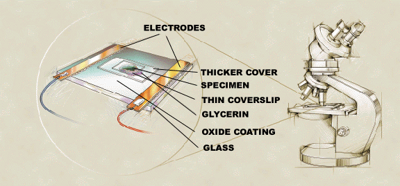 Silk constructed his heater from electroconductive glass of the kind used by automobile manufacturers for defrostable windows. The glass has a thin, transparent layer of either tin oxide or indium-tin oxide deposited on one side. An electric current flowing through this layer can heat the glass to temperatures greater than the boiling point of water. (Although Silk independently developed the idea of using conductive glass, Stephen A. Skirius described a similar project in a 1984 issue of the Microscope magazine.) The main drawback is that I have been unable to find an inexpensive source of the material. So I've purchased and cut up a large sheet of it and will make the pieces available through the Society for Amateur Scientists; details are at the end of this article. Once you have secured the glass, you must prepare it to accept current. Silk used two thin strips of copper about 3 millimeters (about 0.1 inch) wide to form the electrodes. You can cut these strips from a sheet of copper foil, which is stocked by most sheet-metal dealers and art supply shops. Place the glass so that the oxide layer is up and affix the electrodes onto the left and right sides [see illustration above] using a metallized epoxy, which unlike most adhesives will let the electricity through. Resins filled with silver or aluminum powder are available at most hardware stores. If you can't find any, call Epoxies, Etc., in Greenville, R.I. (401-231-2930). Next you'll need to protect the oxide layer from scratching while exposing specimens to the heat. Silk placed a drop of glycerin at the center of the oxide side of the glass stage and covered it with a large but thin coverslip. If you don't have any glycerin, any fluid with a high boiling point will work, such as radiator fluid, brake fluid or motor oil. For the coverslip, Silk recommended a No. 0 grade (the thinnest grade) that is 22 by 30 millimeters (0.9 by 1.2 inches), but just about any size will work. This arrangement lets your specimens respond quickly to any adjustments you may make in the amount of heating. The object of study goes on top of the coverslip. Blanket it with an 18-millimeter square glass cover. For ease of handling, this topmost cover should be of a thicker grade, either No. 1 or No. 2. Fisher Science Education in Burr Ridge, Ill., sells a collection of various coverslips in boxes of 100 for $3 (call 800-955-1177; item number CQS17525A). Finally, attach the electrodes to a power source that can deliver enough current. Silk used a variable 15-volt, 1-amp AC or DC supply. You can probably find such a source at most electronics surplus stores for about $20. Parts suppliers--such as Jameco (800-831-4242 or www.jameco.com)--can also provide lower-power sources, but you may need to wrap the stage partially in insulating material, such as newspaper. Or try picking through the wares of those small electronics suppliers who sell at local swap meets or flea markets. I once came across an entire bin of power supplies for $4 each. Silk reported that his easily heats the stage to 100 degrees Celsius (212 degrees Fahrenheit). Naturally, never leave the stage unattended with the power on. It is easy to get beautiful multicolored images using a set of polarizing filters. These filters act on the electromagnetic nature of light by passing only that energy whose electric field lies along a particular direction, known as the polarization axis of the filter. A double filter made by rotating two polarizers so that their axes are perpendicular should block all light. Odd as this may sound, adding a third polarizer between them can cause light to be transmitted again. Some light will pass through the added filter because its polarization axis is not at right angles to the axis of the first filter. Whatever light does get through must be aligned with the intermediate filter's axis. In effect, this filter rotates the electric field. Therefore, when the rotated light reaches the final filter, some can pass through. Most crystals also polarize light because of the highly regular arrangement of their atoms. A crystal generally polarizes different wavelengths with different efficiencies, which causes some colors to come through more vividly than others. To capture this effect on film, position one polarizing filter above the light source and attach another to the objective lens of your microscope. Most large scientific supply houses carry such filters. Fisher Science Education sells a kit for $23 that allows you to construct both filters and even contains some crystalline material to study (item number CQS19709-3). Or you can experiment with making your own filters. Edmund Scientific in Barrington, N.J., has available high-quality polarizing, thin plastic sheets for $6 (call 609-573-6250; catalogue number H43781). To study crystallization, place on the stage a material with a melting point between room temperature and 100 degrees C. By tuning the power supply to keep the stage temperature near the melting point of that material, you can alternately create and destroy the crystals by making small adjustments to the power. This experiment is much more satisfying than, say, watching salt crystals form by evaporation, during which you get to see such crystals only once before you must clean and reset the stage. There are a number of materials that are safe to melt on the stage. Silk recommended thymol, camphor, menthol, stearic acid, trimyristin or myristic acid. You can obtain a mixture of trimyristin and myristic acid by soaking nutmeg in methanol and then filtering and evaporating the solvent. Most of the other substances you should be able to find in drugstores and chemistry sets. Consult the Merck Index for other ideas. Of course, be careful. Some materials, such as naphthalene (once the active ingredient in mothballs), emit harmful gases when heated. (Modern mothballs often use paradichlorobenzene, which, though classified as an irritant, is not considered toxic to hu