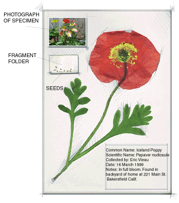 Museum herbariums mount their specimens on cards measuring 29 by 42 centimeters (11 1/2 by 16 1/2 inches). BioQuip sells paper cards of that size for $1.70 per dozen (product no. 3135), and a buffered acid-free rag variety goes for $4.25 per dozen (product no. 3137). Fisher's price is $29 for 100 sheets (product no. CQS17676A). For those on a limited budget, ordinary card stock, though much smaller, works well and is available for under $10 in reams of 250 sheets from any office supply store. But if you want your collection to be studied one day by botanists yet unborn, stay with acid-free paper. Because dried plants are quite brittle, use extreme care when mounting them. Dilute some white glue by about one third with water and smear a thin layer onto a cookie sheet. Coat the backside of your specimen by gently settling it into the liquid. Delicately remove the plant, blot it on a sheet of newspaper and position it onto the mounting card. Dab all parts of your specimen with a paper towel to remove any excess glue. Place a sheet of wax paper and cardboard on top and use your plant press to secure the arrangement until the adhesive sets. Although my early efforts using ordinary Elmer's white glue have held up nicely now for some 25 years, most professionals rely on a concoction they call "botany paste." BioQuip sells two-ounce containers for a little over $3. (By the way, if you know a recipe for this substance, please share it on the Web-based discussion area for this project at the address given below.) Transfer all the relevant information about each specimen from your field notebook to an acid-free paper label and glue it to the mounting sheet. Seeds and other loose parts can be stored by inserting them into thumb-size paper envelopes, known as fragment folders, which can then be glued or stapled to the sheet. You can easily make your own folders, or you can buy them precut from BioQuip in packages of 100 (product no. 3211BA; $15). And don't forget to include any photographs you took, which can be glued directly to the mounting cards. If the old adage is correct, each picture could save you a thousand words of exposition.