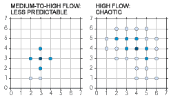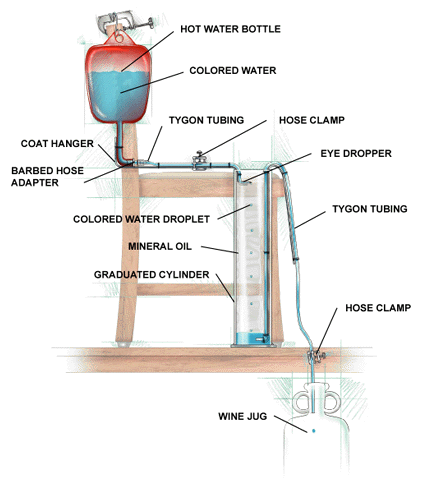 In the 1980s researchers learned that for many real systems the myriad uncooperative complications of nature cause observations to disagree with predictions extremely quickly. You can, for example, take all the temperature, pressure and wind-speed readings you want, but you just won't have enough information to forecast the weather accurately more than seven days ahead. The reason is that the effects of tiny perturbations, even a jet flying over Salt Lake City, can build much more rapidly than scientists had realized, altering the weather in unforeseen ways. Systems that tumble rapidly into unpredictability are aptly termed "chaotic." Now, thanks to a delightful device developed by Mahlon Kriebel, a professor of neuroscience and physiology at the SUNY Health Science Center at Syracuse, you can explore the subtleties of chaos at your own kitchen table. Kriebel's apparatus is a slow-motion version of another chaos classic--the dripping faucet. By dropping colored water droplets through mineral oil, Kriebel slows them enough that the onset of chaos can be readily observed and studied. A graduated cylinder with a volume of 1,000 cubic centimeters makes an ideal chimney to hold the mineral oil, but a tall, clear flower vase would also work well. For the reservoir to hold the colored water, you can use a hot-water bottle with tubing attached. Cut the tubing and mate it with a barbed hose adapter to some Tygon tubing. You'll need a hose clamp to control the flow rate through the tubing and nozzle. Almost any hardware store should have the necessary hose adapter, clamps and tubing. To keep the hot-water bottle well above the nozzle, I fastened the bottle to the back of a chair and placed it on top of my kitchen table. Kriebel fashions his nozzle from the tip of a pipette, but eyedroppers are easier to come by. The opening on mine was too wide, so I filled the tip with candle wax and then used a heated sewing needle to melt a tiny hole in the wax. Hold the tip of the needle against the wax with a pair of pliers and touch a hot soldering iron to the needle right near the dropper. Applying firm and steady pressure will quickly bore the needle through the wax plug. After that's done, insert your nozzle into the Tygon tubing and secure the connection with a liberal dose of aquarium cement. Next, to keep the tubing in place after you've situated it, tie it to a length of coat hanger. Use sewing thread and not twine, because the latter sheds fibers that will contaminate the oil. Then install the assembly into the cylinder with the nozzle's exit hole centered about 10 centimeters (four inches) below the top of the cylinder. Lash a second length of Tygon tubing to another coat hanger and install one end at the bottom of the cylinder. Pinch off the other end of the tube with a hose clamp and set it in an empty wine jug. This setup will enable you to siphon some of the colored water that collects at the bottom so that you can periodically return it to the hot-water bottle. Fill the cylinder with mineral oil from your local drugstore until the liquid just covers the nozzle. Then dye some water with food coloring and pour the solution into the hot-water bottle. Loosen the upper clamp just a bit to allow droplets to form slowly on the nozzle and fall through the oil. You're now ready to begin your excursion into chaos. The slowest flow rates produce droplets that are all about the same size, and so they fall at nearly the same rate. They reach the bottom one after another, resulting in a pattern that can be recorded as 1, 1, 1, 1,... At some slightly higher flow rate, the drops fluctuate in size. The larger drops fall faster in the mineral oil than the smaller ones do (the former have a higher terminal velocity because of their greater mass per surface area), and so they catch up and push into the smaller drops, thus falling in clumps of two. At this flow rate, the pattern is 2, 2, 2, 2,... If you increase the flow rate a bit more, you may find a setting at which they will tend to fall in groups of three. At even faster rates, all heck breaks loose, with data that are not predictable but aren't random either. To understand why, consider the rolling of dice, which is similar to the falling of droplets in that both depend on intractable factors. Change the spin rate or the trajectory of a die slightly as it leaves your hand, and you completely change how it rolls. Likewise, the size of a droplet and its rate of descent depend on uncontrollable variables such as its vibration as it pulls away from the water stream and the fluctuating pressures inside the nozzle. A truly random process, however, is completely unpredictable; whatever you observe one instant has no relation to what came before and no effect on what comes after. In this sense, rolling a die is random, because the odds of getting a "1," for instance, are always one sixth, regardless of how the die has rolled before. But falling drops behave differently, because although one state may not determine the next, it can affect it. For example, if I continue rolling a die I will eventually roll two consecutive 1s. But at a fast flow rate I never observed two single drops arriving one after another. I thus concluded that creating a single drop always caused the system to enter a state that produced only multiple drops. In other words, the arrival of a single drop guaranteed that a cluster would follow. At least that was some information. And I knew even less about what was coming after that. The fact that each state affected the next but that the outcomes became rapidly less certain is the hallmark of chaos. Chaos inhabits the gap between the perfect predictability of a frictionless pendulum and the pure randomness of rolling dice. Chaotic systems are easy to spot with the help of a special graph called a return map. For the water-drop data, plot your first point by taking the first number in the series as the x coordinate and the second number as y. For the