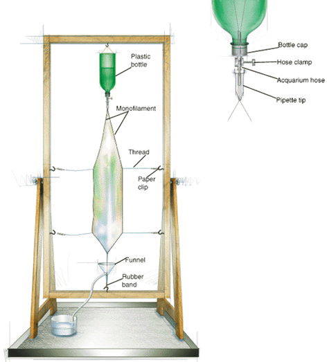 Rutgers's method is as ingenious as it is simple. He poises a reservoir of soap solution above two stretched monofilaments (single-strand string, such as 20- or 30-pound fishing line) and allows gravity to draw the solution over them. Once the filaments are thoroughly wet, he slowly separates them with four fine threads. A fast-flowing and extremely uniform soap film forms between the filaments. When he wets a small object, such as a toothpick, and pokes it into the flow, vortices form in the object's wake. The result is an awe-inspiring display of turbulent motion in two dimensions. I have now spent hours ruminating the complex interactions between patterns of vortices that I have created with toothpicks, hair combs and knife edges. A plastic two-liter soda bottle, hanging upside-down, makes an ideal reservoir for the soap [see inset diagram at above right]. In the bottom, cut a large hole (for refilling the solution) and two small holes (for stringing the monofilaments). The solution will drain out the bottle cap through a five-centimeter length of soft silicone tubing, which you can buy at an aquarium supply store. Drill a hole in the bottle cap with a diameter slightly greater than the inner diameter of the tube. Then cut the tip at a diagonal and thread the tube through the hole. This should create a watertight seal. If not, a dollop of aquarium cement will.