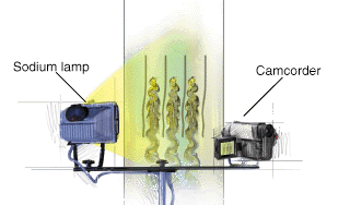 The bottle hangs from a short piece of monofilament, perhaps 30 centimeters long, strung through the small holes. A second piece of monofilament, four meters long, will guide the soap solution. Fold this piece in half, thread the two ends through the two small holes and pull them out through the tubing. At this point, you can screw the cap back on the bottle. To control the flow of solution through the tubing, attach an adjustable hose clamp, which you can find at any hardware store. To smooth out the flow as it moves onto the filament, Rutgers slides a disposable plastic pipette tip over the end of the tube, but you can also use the neck of a plastic eyedropper. You may have to trim the tip to keep the fluid flowing fast enough to maintain the film. We hung the apparatus from a beam in my workshop, but Rutgers recommends a wooden frame that can be easily set aside for later use. The monofilaments are kept taut by a large rubber band at the bottom [see illustration above]. Tie the two strands together, pass them through a small plastic funnel and tie them to the rubber band. A plastic tube from the funnel drains the solution into a container. Or you could just let it drip onto a large towel or into a pan. Last, take four thin threads about 50 centimeters long and attach a paper clip to one end of each. Tie the other ends to the monofilament. To create the film, bring the filaments together and open the hose clamp to wet them thoroughly. Then gently separate the filaments by pulling on the threads and secure the paper clips on hooks screwed into the wooden frame. This forms a film with a long straight section in which the film flows with a nearly constant speed. Opening the hose clamp increases the speed. The film will break often during your experiments, so just repeat this procedure to regenerate it. The ideal film-making mixture is a 1 to 2 percent solution made by combining one or two parts of clear liquid dishwashing soap with 100 parts water. In English units, a 1 percent solution results from one teaspoon of soap in one pint of water. Whatever you do, avoid those bubble-blowing fluids. Gravity limits a bubble's lifetime by draining fluid away from the top until the bubble ruptures. To slow this down, toy companies add glycerin to increase the solution's viscosity. But viscosity is the last thing you need if you're studying turbulence, because high viscosity damps out turbulent motion. The film flows between about 0.5 and 4 meters per second (1 to 9 mph)Ñfar too fast to study the millimeter-size vortices by eye. Moreover, the turbulence can be seen only under high-contrast lighting. You'll need a strobe light or video camera with a Òsports shutterÓ option, which limits exposure on each video frame to between 1/1,000 and 1/10,000 of a second. Most new camcorders have this feature. You can also take fantastic still photographs using a fast shutter and high-speed film. Rutgers recommends ASA 3200 black-and-white film (which provides the best contrast) and a shutter speed of 1/2,000 of a second or faster. The light source must be bright enough to compensate for the quick shutter, and the best way to create high contrast is to use monochromatic light. Rutgers uses a low-pressure sodium ÒsoxÓ lamp, which generates an intense band of yellow light with a wavelength of around 585 nanometers. Because essentially all the energy goes into a single wavelength, you don't need a high-wattage bulb. An 18-watt sox bulb is plenty bright and retails for about $40. Unfortunately, it requires a fixture with an electric ballast, which costs about $100. You can find such fixtures at most industrial-lighting specialty stores. To save money, check a local industrial liquidator or an on-line auction site such as eBay. com. You'll want a floodlight with a trunnion fixture that can be mounted to a tripod. If you're in the U.S., make sure the fixture is compatible with a 120-volt outlet.
