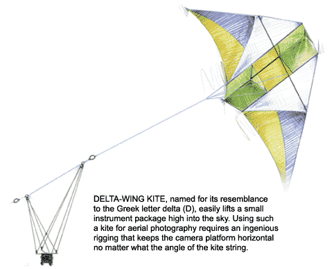 Kites are wonderfully inexpensive platforms for aerial photography, something countless scientists, from archaeologists to geologists, use in their research. The view obtained from easy kite heightÑsay, 1,000 feet (300 meters) upÑis perfect for monitoring all kinds of environmental changes. But picture taking is not all that's possible: new lightweight data loggers and sensors of all kinds should make for an explosion of kite-based research of other types. Aspiring meteorologists could, for example, determine temperature as a function of altitude using a thermocouple and a simple pressure sensor. And lifting a hot-ball anemometer (see the November 1995 column) would reveal the speed of the wind aloft. Although I describe here only kite-borne aerial photographyÑa technique called KAP by its practitionersÑI'm certainly looking for clever research projects of other kinds using kites. If you've done such work, please let me know so that I can share your inventiveness with this column's many interested readers.