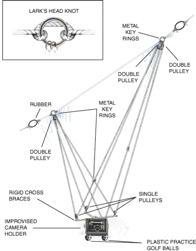 Other point-and-shoot cameras would work, too. But the more limited self-timers on most other models require you to reset them after each photo. Although it is tedious to have to reel in your kite that often, thousands of breathtaking aerial photos have been taken in this way. With any camera, use a film speed of at least ASA 400 and set the shutter to the shortest possible exposure for the light conditions to avoid motion blur. Advanced practitioners adapt equipment intended for radio-controlled model airplanes. These "servos" can both rotate and tilt the camera, and also trigger the shutter on command. Consult the Web site of the Society for Amateur Scientists to learn more about such options. Whatever strategy you adopt, it's a good idea to affix "landing gear" made of practice golf balls to the camera housing as shown. They make for a softer touchdown should the wind die off suddenly, delivering the instrument gondola all too quickly back to terra firma.