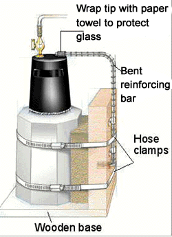 So what? Well, in 1896 a University of Cambridge physicist named C.T.R. Wilson discovered that certain subatomic particles leave visible trails when they pass through supersaturated vapors. Why? The particles convert some neutral atoms in the air into charged ions, which, like dust specks, induce droplets to form. Wilson thus was able to fashion the first "cloud chamber" to reveal the trajectories of these ionizing particles. While in high school, I spent many frustrating hours trying--and failing--to build cloud chambers from instructions I had read in this department. Then, as a college sophomore, my interest was rekindled when I noticed that a cloud had formed in the neck of a freshly popped bottle of champagne. Within two hours I had converted that bottle into my first working cloud chamber. My design has since evolved, but it remains quite simple and inexpensive to build. The current version costs less than $30 to put together. The "generator" (a canteen) is filled with a mixture of vinegar, alcohol and ink. It's pressurized by adding baking soda. The carbon dioxide given off forces the colored liquid out and into an attached drinking glass, where the fluid acts like a piston to squeeze the gas within. The compression heats the air and causes it to become saturated with vapor from the liquid. Opening a valve allows the fluid piston to drop, which lowers the pressure and temperature of the air, which in turn supersaturates it. I use a one-liter plastic canteen with flat sides and a wide mouth. The cap, being slightly tapered, fits snugly inside a tall drinking glass. If you find that the cap rests so deeply inside your glass that the canteen cannot be attached, ask the folks at a local glass shop to cut off some of the rim. You might also ask them to bore an off-center hole in the base of the glass for a stopcock--or do it yourself. Surprisingly, it's not hard to drill glass. Just cut several notches in the end of a piece of brass tubing. Then put it into the chuck of an electric drill and turn the notched end against the glass while bathing the surface with a slurry of number 120 Carborundum powder and water. Apply a gentle but steady pressure. It's best to use a drill press, but the job can be done with a handheld electric drill. Wear suitable eye protection (as always, when working with power tools) and gloves, in the event the glass should shatter. Though unlikely, it's conceivable that your glass could break when it is pressurized. So you should also wear your safety glasses when experimenting. And you can add a further level of protection by coating the glass with plastic. Ace Glass in Vineland, N.J. (800-223-4524 or 856-692-3333), sells a special plastic coating (catalogue no. 13100-10) designed to hold the glass shards together in case of a catastrophe. Half a liter costs about $30. When your protective coating has fully dried, pass the threaded brass fitting through the hole, seal it carefully with silicone aquarium cement, secure it with a washer and nut, and add the stopcock. Also, find a supply of small ceramic magnets (Radio Shack catalogue no. 64-1883 contains five such magnets) and glue one inside the glass at the top center using silicone cement. Next obtain a short length of PVC pipe with an outer diameter that is just slightly smaller than the mouth of the canteen. Cut a hole in the cap to accommodate the pipe, which should reach down to about two centimeters above the bottom. Glue the top end into the hole in the cap. Then stretch some plastic window screening across the top of the pipe. The mesh reduces turbulence in the fluid, thereby reducing turbulence in the air inside the chamber. Secure the screening with a nylon cable tie. Then punch a small hole in the center of the screen. (You'll need this opening for access to the chamber.) Finally, glue the cap into the glass using plenty of silicone cement and attach the lower stopcock just as you did the upper one.