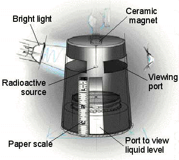 Adding baking soda to the liquid while everything is sealed up is simpler than you might think. Just epoxy a ceramic magnet into a small bag fashioned from the toe of a nylon stocking. I suggest you begin by adding 2.5 milliliters (about half a teaspoon) of baking soda to the bag, but you'll probably need to adjust that amount after some trial and error. Place the baking soda on a small piece of paper towel and insert this makeshift holder into the bag. Affix the bag just below the neck of the bottle using a stack of two magnets on the outside; removing the outer magnets releases the baking soda into the solution. I put as many as five bags inside at once so that I can repeat the experiment without opening the canteen. Mix two liters of liquid by combining equal parts of distilled vinegar and the most concentrated isopropyl alcohol you can find. Squirt in some ink, which (like the black spray paint) will make the tracks easier to see, and add two milliliters of salt. Fill the generator bottle with this solution to within about one centimeter of the nylon bags. Open the top stopcock and then screw the glass cloud chamber on tightly. You may need to cover the threads with Teflon tape or petroleum jelly to get a pressure-tight seal. Insert the whole assembly in its holder. Now open both stopcocks, carefully suck on the tube until liquid fills the cloud chamber about halfway, then close both stopcocks. Position a bright light to one side of your viewing port. Drop in a bag of baking soda and monitor the fluid level in the cloud chamber, bleeding the pressure with the lower stopcock when the compression ratio rises above about 1.33. (If this ratio is below about 1.25, tracks won't materialize, and if it is above 1.38, a dense cloud forms and obscures everything.) Wait a minute or so, then rapidly open that same stopcock completely. Particle tracks can appear only during the next brief instant, so the odds of seeing a vagabond cosmic ray are not at all good. A potent source of either alpha particles (helium nuclei) or beta particles (electrons) provides a much more satisfying show. Alpha particles produce short tracks, whereas beta particles leave long ones. You can obtain both an alpha and a beta source suitable for this project from the Society for Amateur Scientists. Epoxy your radioactive source to the tip of a nail that has a large, flat head. Lift this assembly through the hole in the window screening and into the cloud chamber using a drinking straw and stick the head of the nail to the magnet at the top of the glass. This arrangement will hold the source securely in place until you want to swap it for another one. Though easy to build, my cloud chamber has its limitations. The optical