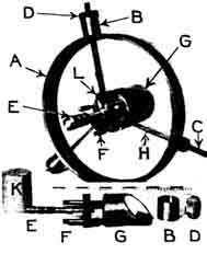 Corner "Seldom have I seen in your columns a description of a satisfactory, easily made, yet rigid, secondary mirror support. I send a photograph of a type of support which I have used for 15 years in reflectors from 6" to 20" aperture. During that time I have found it to be the essence of rigidity, possessing the added merit of rapid adjustability. I do not claim originality of design; in fact the first telescopes in which I saw it used were those manufactured by Mr. J. T. Ward, of Wanganui, New Zealand. I strongly believe that a similar support was used by Browning, of London. "My first reflector was a six inch, made in 1923 according to the articles by Ellison in English Mechanics. The flat support was made of the crudest materials, by the use of simple tools such as hacksaw, file, and a kit of bicycle tools, and it performed perfectly. "The photograph shows at the top a complete assembly for a 12-1/4" Cassegrain, and, below, a flat mount from a 10-1/2" Newtonian, the last mentioned instrument having been made for selenographical work [study and 7 mapping of lunar detail.-Ed.] A is a strong steel ring, which fits just outside or within the tube proper. At positions 120 degrees apart the steel ring, three bolts, C, pass through square holes cut in the ring. The fit is easy. These bolts are riveted to flat strips of spring steel, H, which form the spider. A sleeve, B, fits over the square portion (shown near C) of each bolt, and tension on the spider system is maintained by the knurled nuts D. The support for the mirror mount is a three armed steel spider, L, each arm being slotted and firmly bolted to a spring steel spider arm. "C is a brass tube holding the mirror. It is firmly attached to a circular steel plate by means of the three adjusting screws F. A helical steel spring fits over each adjusting screw and, for rigidity, is maintained at considerable compression. These springs are shown in the flat mount in the lower portion of the photograph. "The mirror mount is attached to the spider by means of the elongated nut E. This screws on to a bolt attached to the circular steel plate, and which passes through a hole bored or drilled in the heavy steel spider E is long, to facilitate attachment in the relative gloom of the interior of the tube. "The secondary mirror is adjusted centrally by the knurled nuts D. Collimation is effected by the adjusting screws F. "K is a light-weight metal cover which slips over the brass mirror mount when the telescope is placed away for the night. "Professor W. H. Pickering stated that the New England climate was the world's worst as far as observing was concerned. It could not possibly be worse than the Ozark climate in this respect. After ten years of it I find myself longing for the steady New Zealand atmosphere." When a prism is used for a diagonal the mount will of course be modified accordingly. Few types will need so fine a mount.