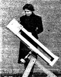 Corner Admittedly, this is not the telescope the average person has in mind to make: not elaborate enough. To attain one's dream there are two ways. First, study the literature over and over, make numerous designs evolve a complete one, build it. Second, study the literature, make a simple design like that below, build it, use it for a few weeks or months, and then, in the light of actual experience (which inevitably brings to light numerous factors which no amount of mere study will reveal) design and make a telescope that will satisfy you. Those who choose the first course often say later: "I don't think so well of this design of mine as I thought I would, but I put too much work on it to discard it lightly now." For the preliminary telescope the Watrous typo is offered as an excellent solution. The axes are common pipe fittings. First, a T with long nip and pipe-nut is attached to the main leg of the tripod through a hole. This T, also the other T shown, is bored out internally-about a 50-cent machine shop job-to take the two stub shafts. (By another arrangement, sometimes used, the axes turn on the threads already on the fittings, but since pipe fittings have tapered threads, this usually results in annoying looseness). The lead counterweight is cast around a sleeve of larger pipe which is anchored with a set-screw. The square tube of the telescope is made of straight 1/2" stock, wood, two at each corner, edge nailed (better screwed) and is very rigid. Paint inside black. If near bright lights, enclose the lower 12" or so. Make main leg of tripod parallel the Earth s axis. Vary the details to suit your own taste Larger pipe fittings are suggested: Dr. Watrous himself mentions that the telescope shakes a little too much in a breeze.