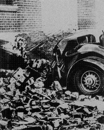 Beach, California, 1933. Exterior walls collapsed onto parked cars