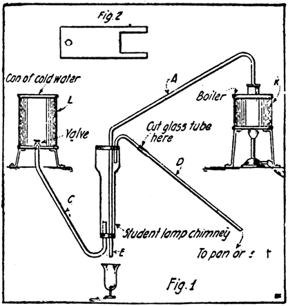 The boiler K is an empty coffee can. A hole is cut in the cover and the neck of an empty maple syrup can is soldered over it. The cover is then soldered on the can so that the steam cannot escape. Three pieces of tin are next soldered on to form a support. Another can L is fitted with a small faucet which can be obtained from an old gas jet. This can is supported on legs like the boiler. Care should be taken that the bottom of the can L is on a level or higher than the top of the condenser. When the water boils in can K, the steam passes through tube A. The faucet on can L is turned on; cold water flows through a tube C and circulates through the condenser and flows out through tube D into a sink or a large pan. The distillate is caught at E. If, when the water is turned on, the lower cork leaks some melted paraffin should be poured slowly into the tube and allowed to harden. This may be done on both sides of the lower cork. If anything besides water is
