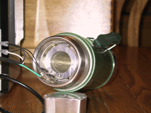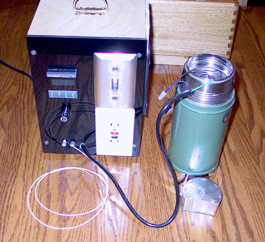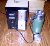 A Small FurnaceThe box on the left contains a temperature controller from Omega (ebay $60.00), a fuse, a ground fault socket and a switch. Coiled in front of it is another RTD for the controller's use. The thermos contains a heat rope (local surplus house, $1.50) wrapped around an aluminum core. The controller works remarkably well. It will easily hold the setpoint temperature at plus or minus 1 degree. The core is bored out enough to admit the stainless cell.