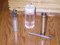 Check out THIS graph. But nothing's ever easy. I found after a few runs and refinements that the thermometer has a bit, I currently estimate 0.42 ohms, of self-heating from the current flowing through the element. I calculated the estimate by measuring the temperature at two different current levels, 1 mA and 0.1 mA, and figuring the "zero current" reading. I found the Callendar-Van Dusen Equation. It allows one to model the non-linearities in a platinum sensor. It's a nice polynomial that needs only 4 (4?) coefficients. I just got R0. Only need A, B and C. Calibration, part 2I got a mercury cell from The Society for Amateur Scientists. I had James make another thermometer well because the one that comes with the SAS cell is too small for the 8mm thermometer stem. An initial run shows a promising plateau but I haven't refined my methods enough to share the results. I hope I can get another coefficient with it.With an accurate barometer and a bit of math (see the Boiling Point of Water Calculator) I can use the boiling point of water for the third coefficient. Really haven't spent much time with it yet either but it looks good so far. Now I just need one more coefficient. The metal cell in the picture above is hopefully a melting point of tin cell. It is the same theory as a melting point of mercury cell but works at 231 degrees C rather than -38 degrees C. I got some "99.99% pure tin" from a casting house ($6.00/kg) and turned the cell from stainless steel on a small metal lathe. The pros use metal or glass cells sealed to the outside air and lined with a carbon crucible. They also use 99.9999+ (also known as 6 nines) pure metal. Costs hundreds of dollars per ounce. I thought I'd give it a try with the $6.00 stuff and see what I could see. Just need something to melt it in. Shawn comes through again with A Furnace In A Thermos.